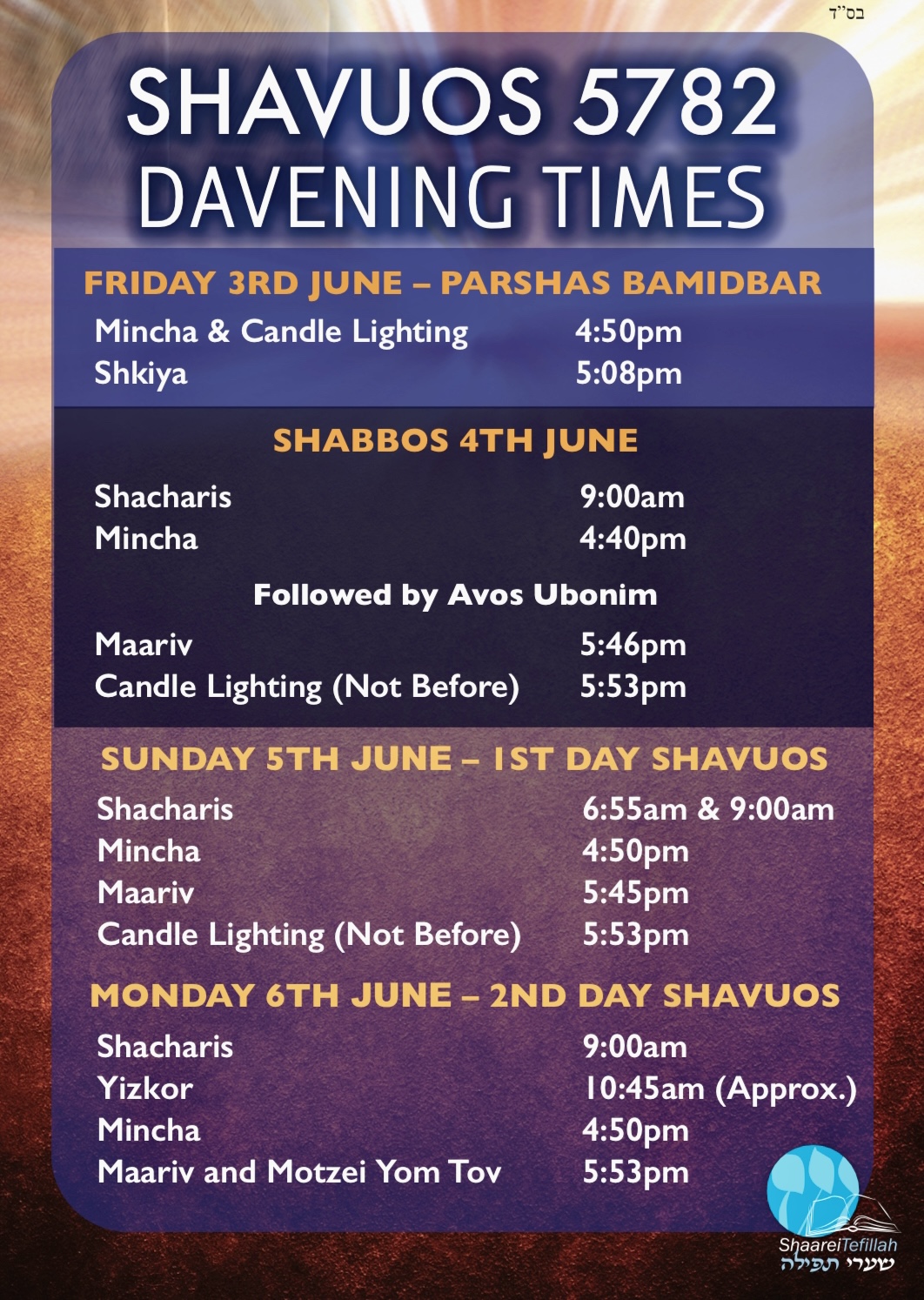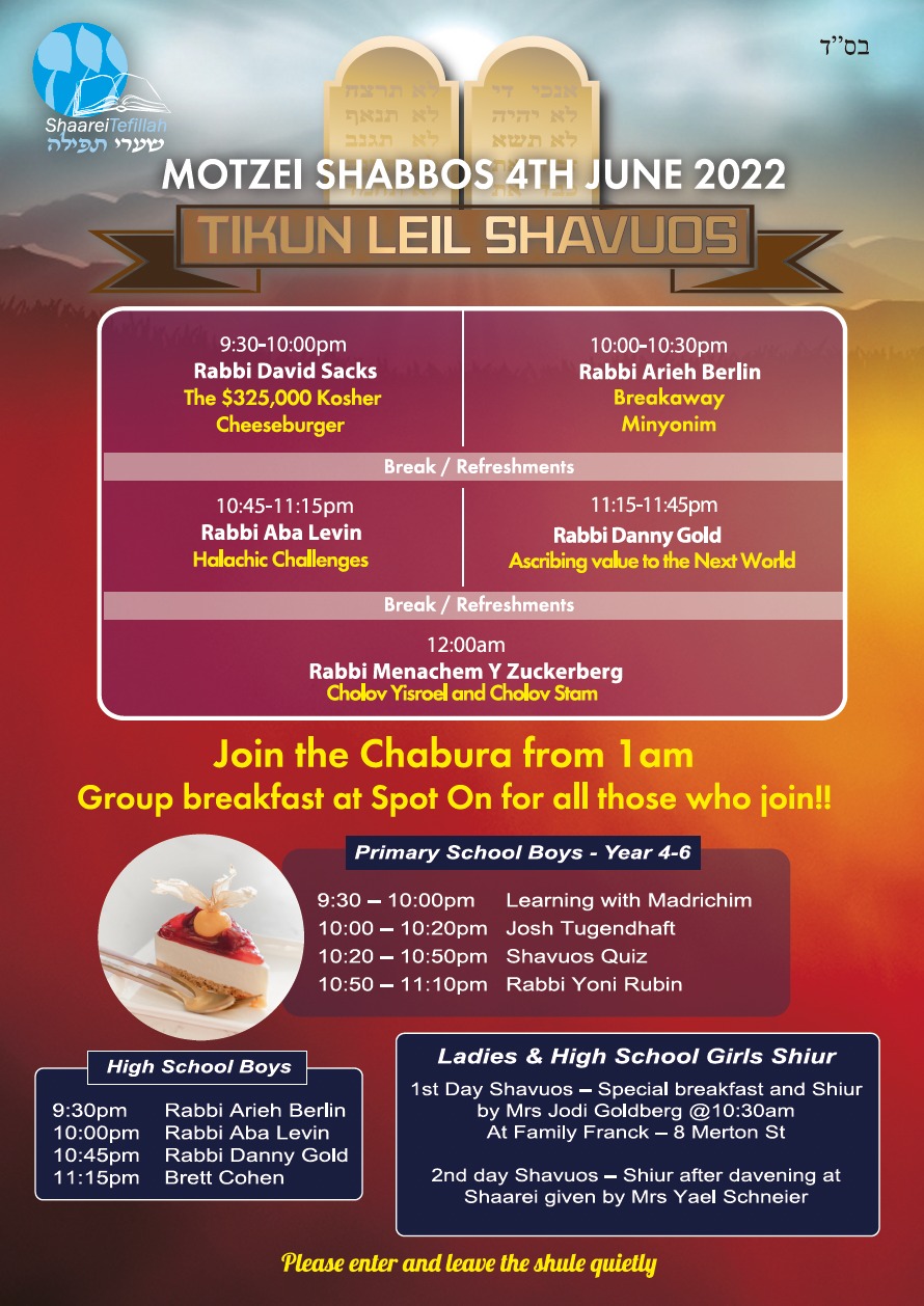 Please see attached Shavuos Times and Tikun Leil Program