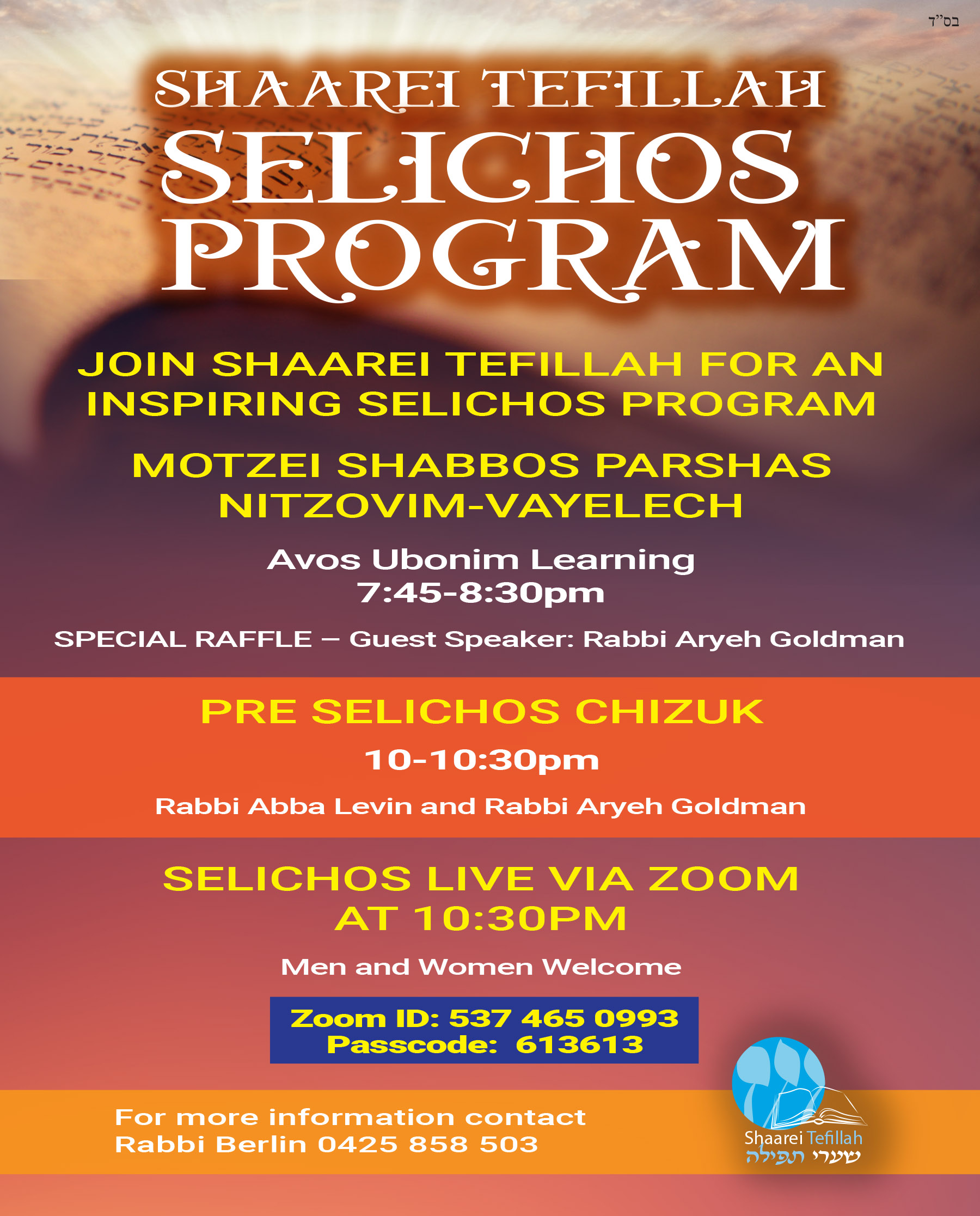 Please see attached flyer for Shaarei's Selichos Program (Next Motzei