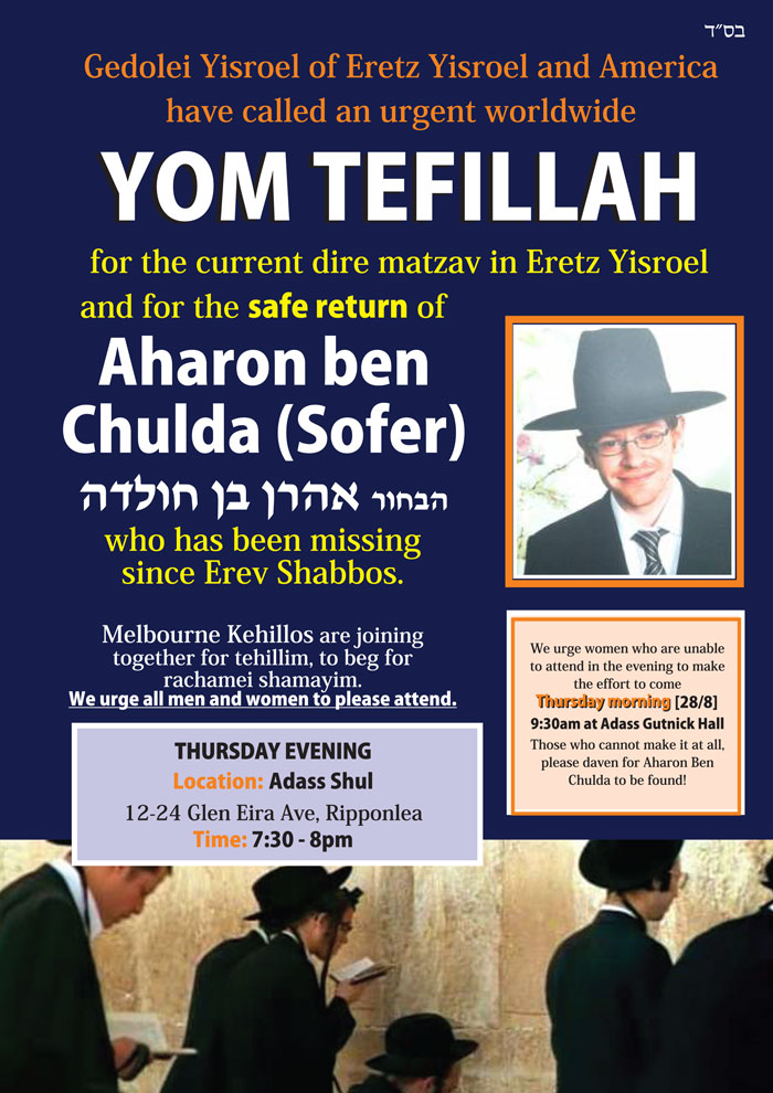 For the safe return of Yeshiva Bochur - Aharon Sofer (Aharon Ben Chulda)