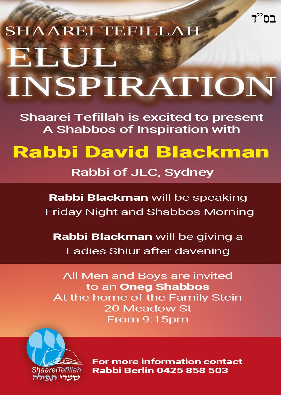 Rabbi David Blackman will be giving a ladies shiur this Shabbos Morning