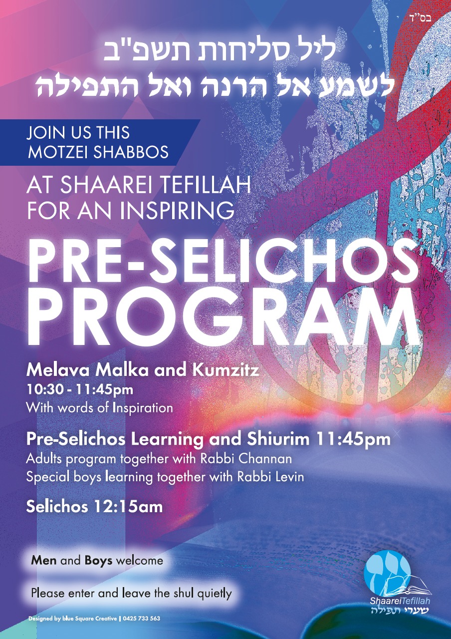 Pre-Selichos learning and Shiur together with Rabbi Channan 11:45pm