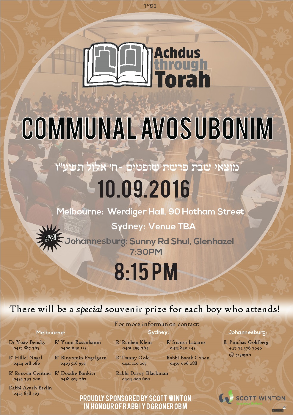 Avos Ubonim will take place on Motzei Shabbos @7:40-8:25pm