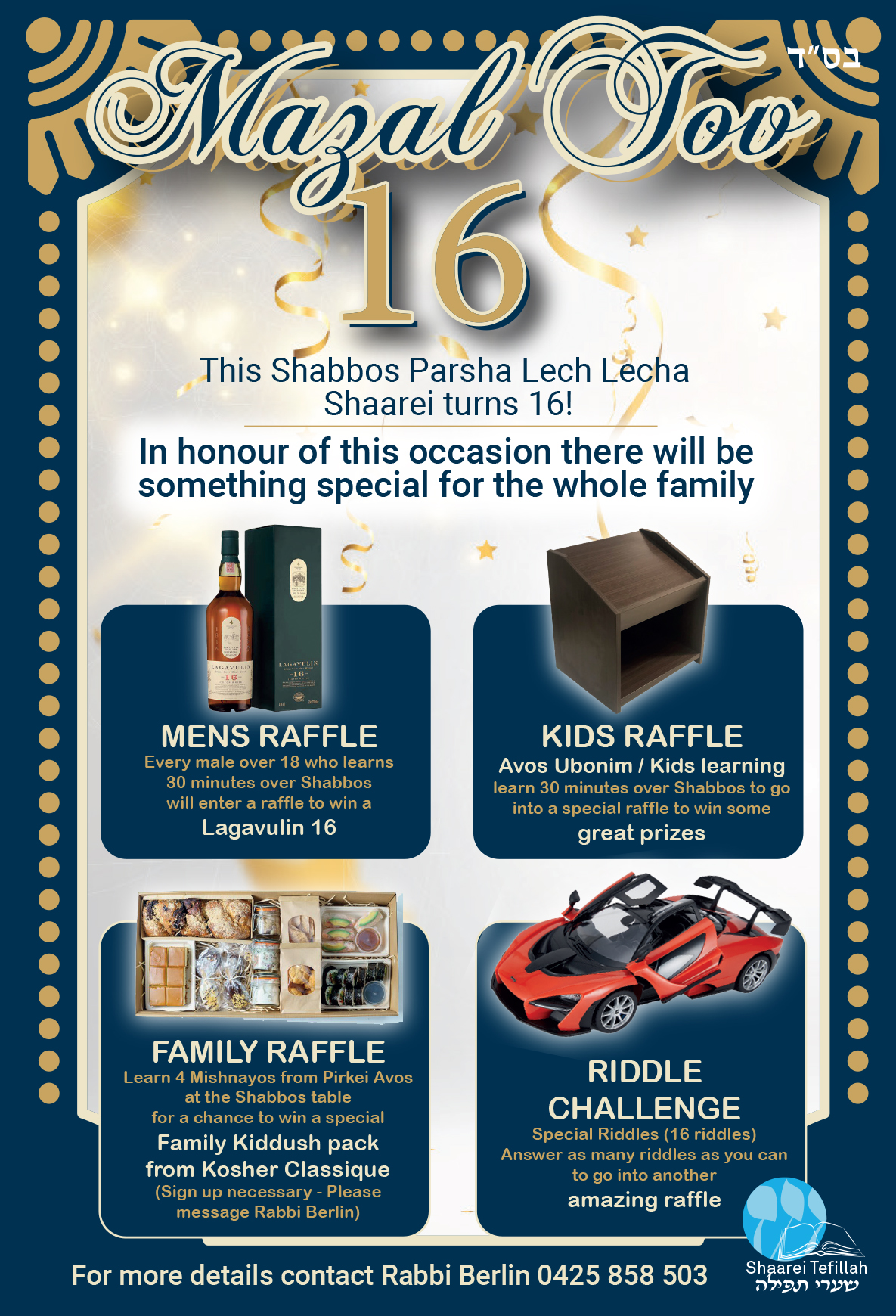 Parshas Lech Lecha Shabbos Times Erev Shabbos Shabbos Day Plag HaMincha 6:16pm Latest time for Shema 9:50am Candle Lighting 7:19pm Shabbos Ends 8:21pm Shkiya 7:37pm Mazal Tov Shaarei Tefillah!! This Shabbos is the 16th Anniversary since Shaarei started See attached flyer for something special for the whole family Short Vort on the Parsha In this week's Parsha Hashem says to Avraham Avinu (12;2) 'I will make you into a great nation and bless you and make great your name and there will be Brocha.' Rashi ascribes each part of this sentence to each one of the Avos. 'I will make you into a great nation' refers to Avraham, 'I will bless you' appertains to Yitzchak, and 'I will make great your name' refers to Yaakov. But, you, Avraham will have brocha, ie it is with Avraham that there will be a chasima (a signing off). This is normally understood to refer to the opening brocha in Shmone Esrei that mentions all the Avos but ends with 'Magen Avraham' - mentioning only Avraham. The Kotzker Rebbe has another way of understanding this Rashi. He says that Torah, Avodah (tefillah/korbanos) and Chessed (Pirkei Avos 1;2) correspond to the three Avos. Chesed is the one which matches Avraham. Rashi citing that 'with you Avraham shall be the signing off,' means that just before the time of Moshiach there will be a reduction in widespread Torah and Avodah, but an increase in the amount of Chesed [represented by Avraham] in the world, as Chazal say 'Yerushalayim will be redeemed through Tzedakah.' It means that the ending part of history (history's signature) before Moshiach will see much Chesed.